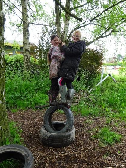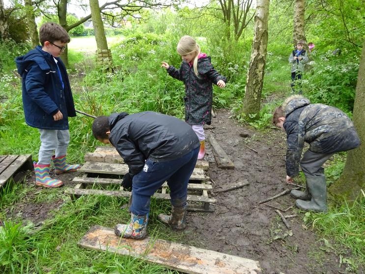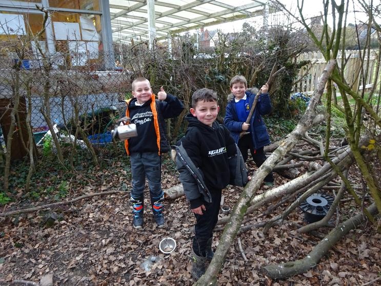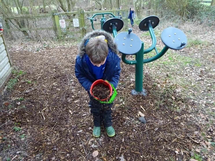 3 March Forest school included moving the bark onto the paths and around the equipment then building and playing.